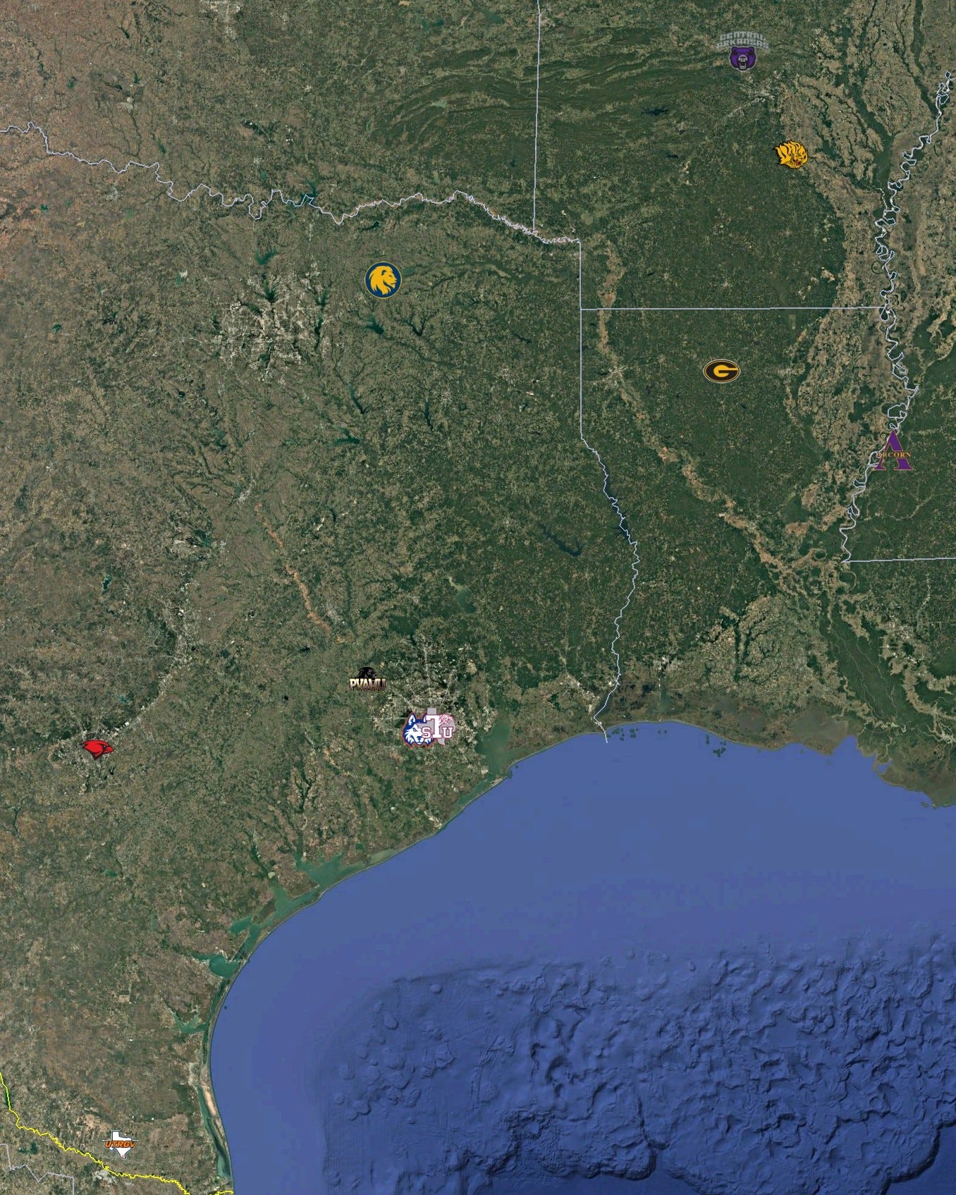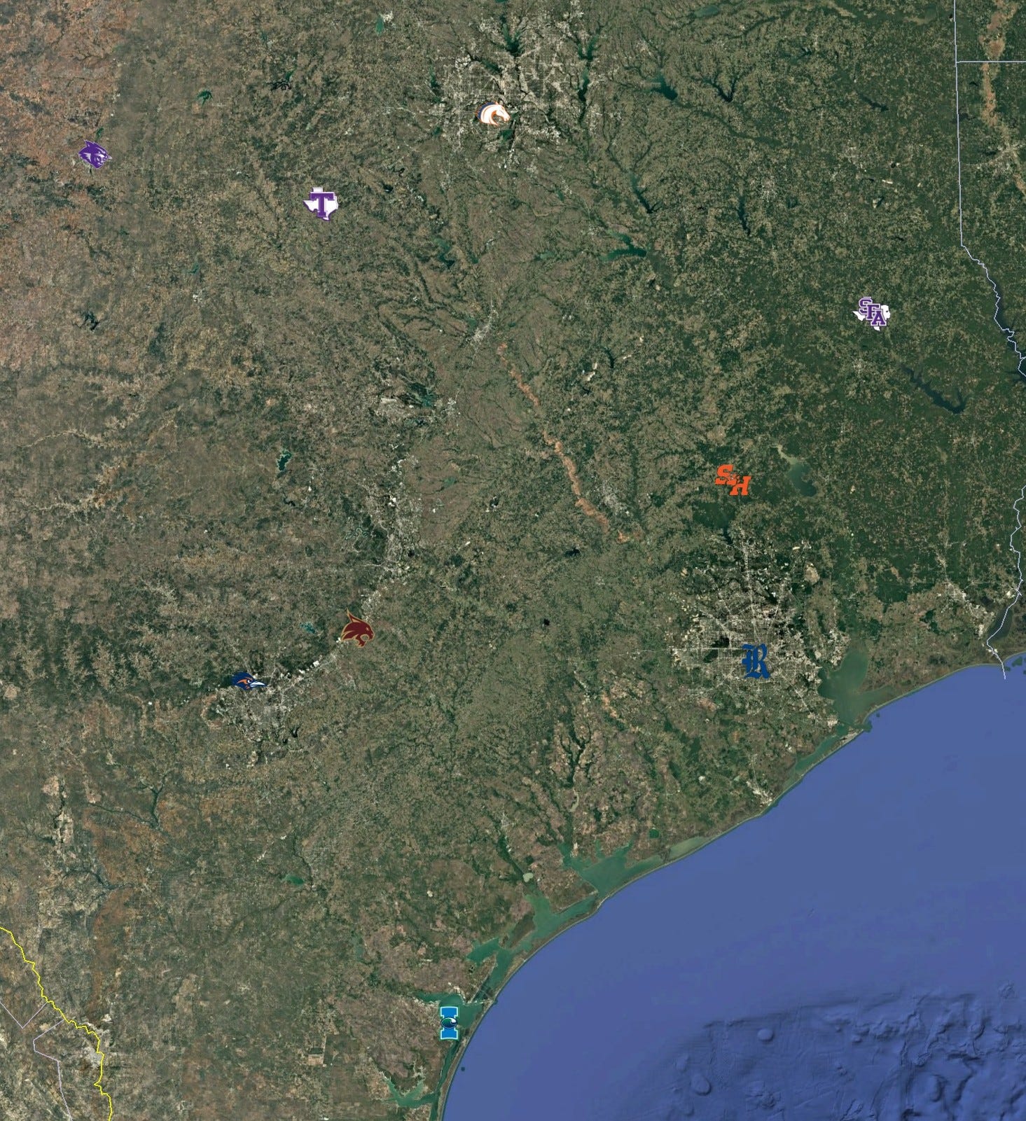 These sure are nine schools located in Texas. They come pretty close to forming a nice triangle shape. I don’t know, man, what am I supposed to say here?
