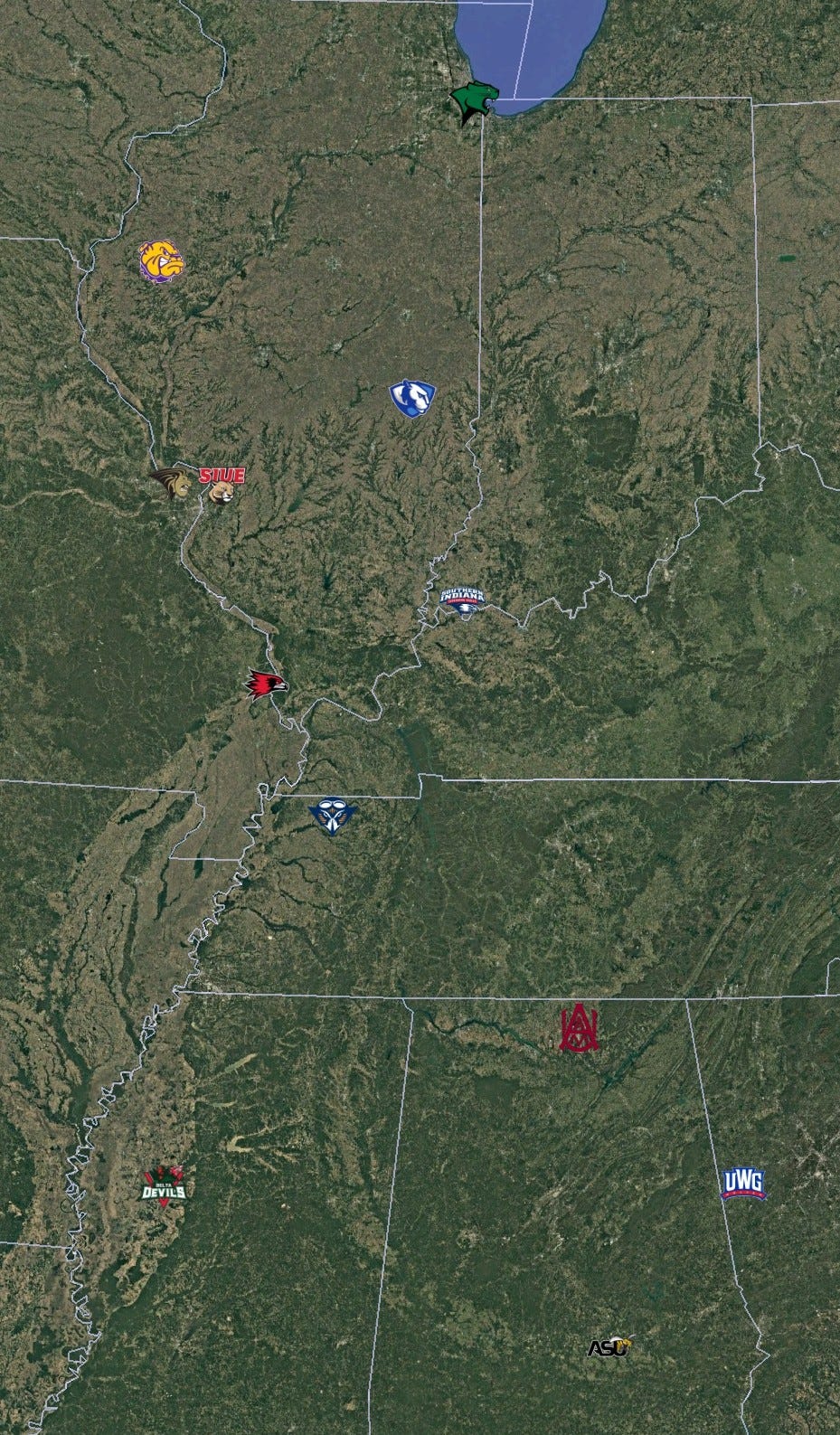 Alabama A&M, Alabama State, Chicago State, Eastern Illinois, Lindenwood, Mississippi Valley State, SIU Edwardsville, Southeast Missouri State, Southern Indiana, Tennessee Martin, West Georgia, Western Illinois