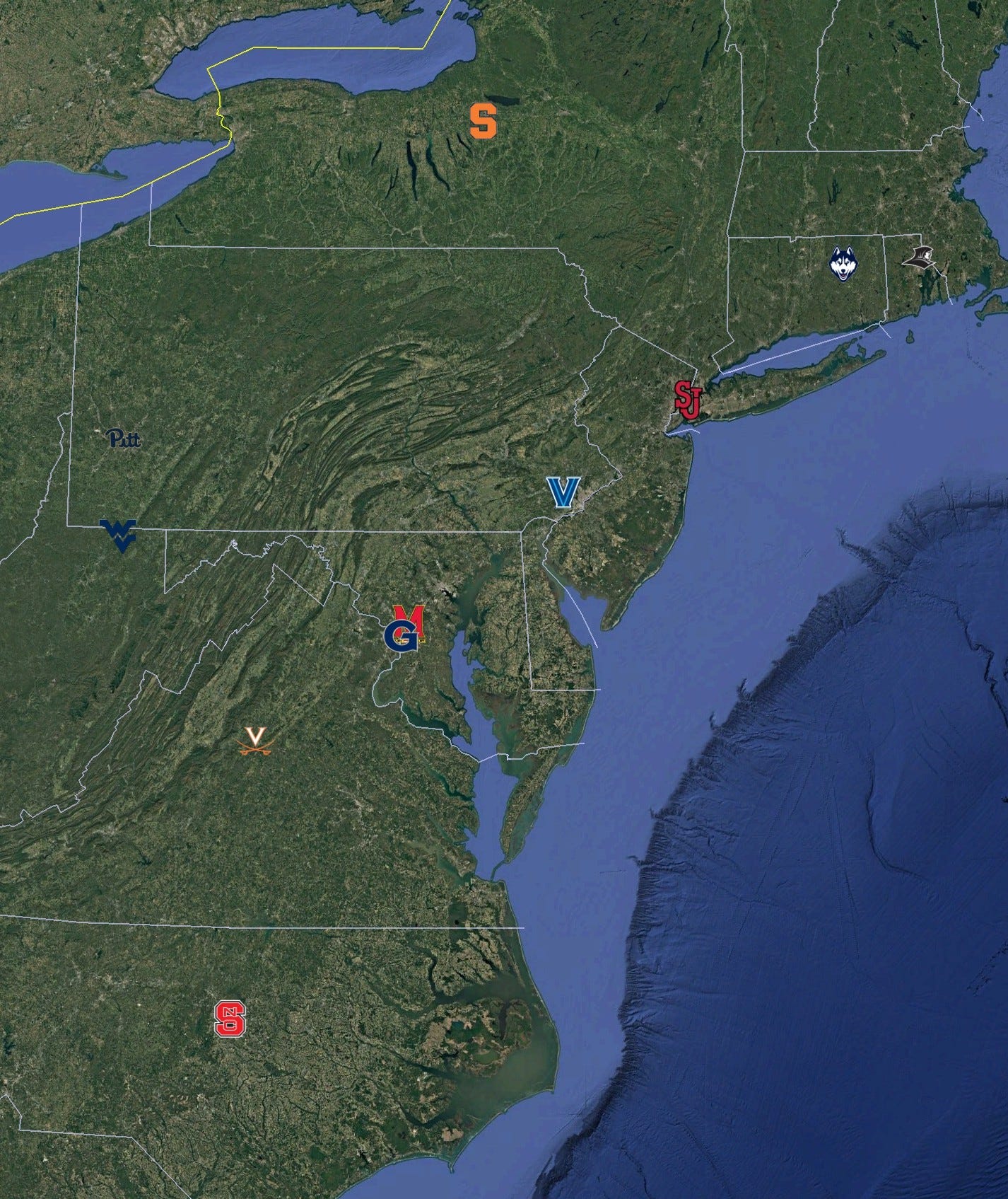 UConn, Georgetown, Maryland, NC State, Pittsburgh, Providence, St John’s, Syracuse, Villanova, Virginia, West Virginia