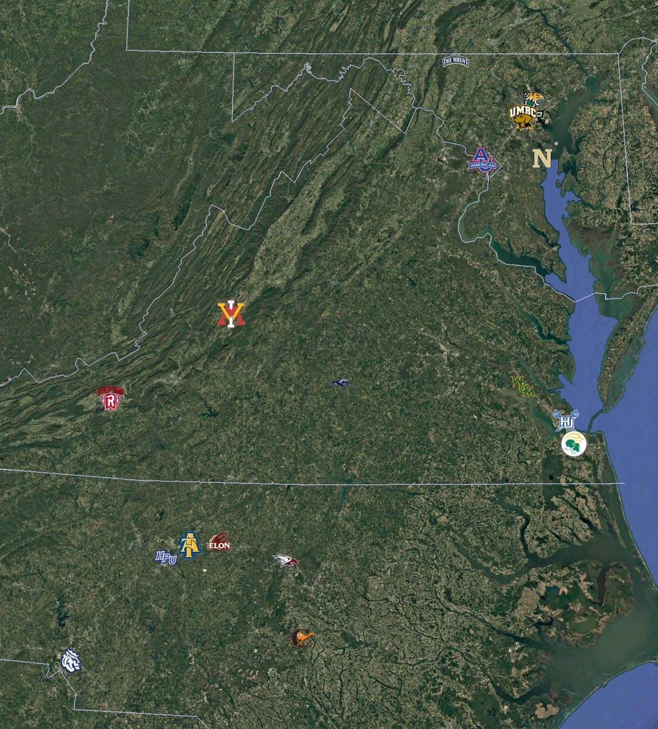 American, Campbell, Elon, Hampton, High Point, Longwood, Loyola MD, Mount St Mary’s, Navy, Norfolk State, North Carolina A&T, North Carolina Central, Queens, Radford, Towson, UMBC, VMI, William & Mary