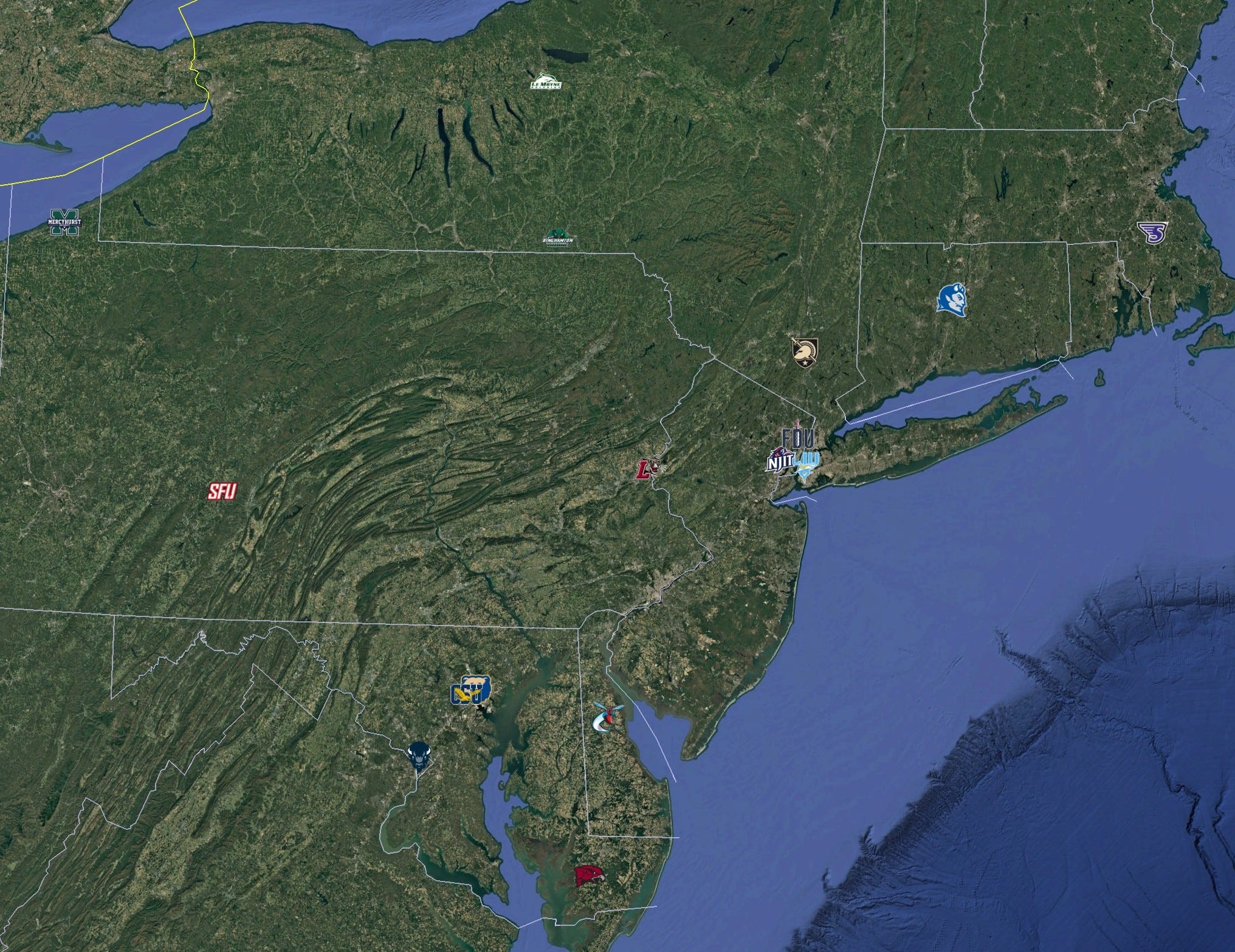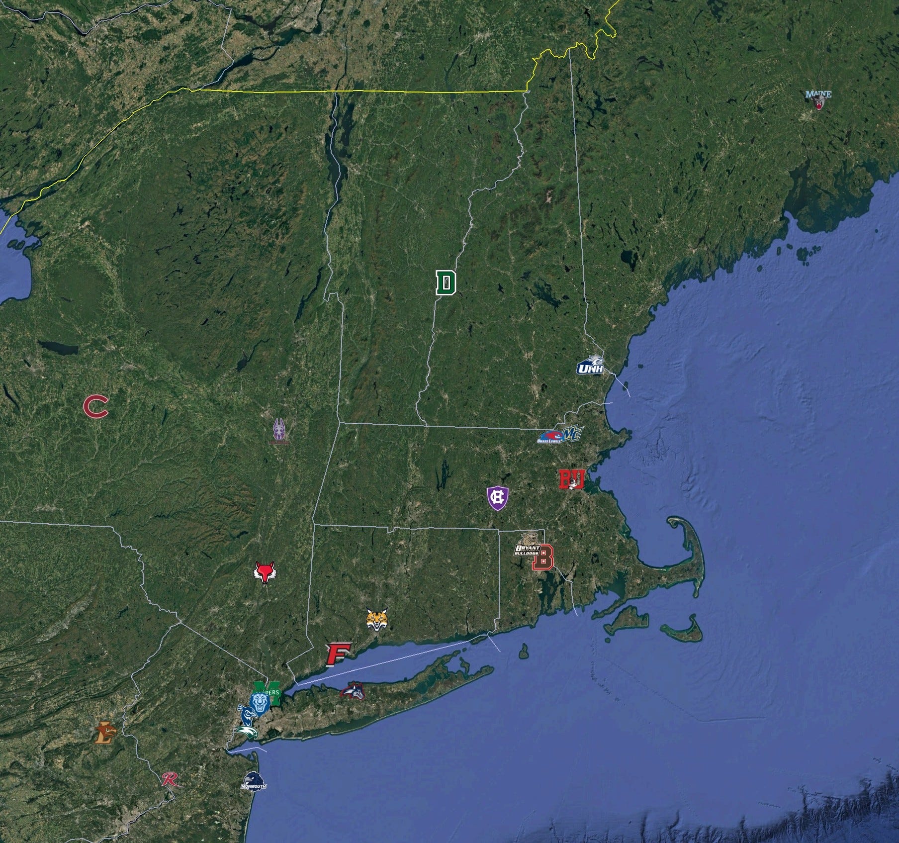 Albany, Boston U, Brown, Bryant, Colgate, Columbia, Dartmouth, Fairfield, Holy Cross, Lehigh, Maine, Manhattan, Marist, Merrimack, Monmouth, New Hampshire, Quinnipiac, Rider, Sacred Heart, Saint Peter’s, Stony Brook, UMass Lowell, Wagner