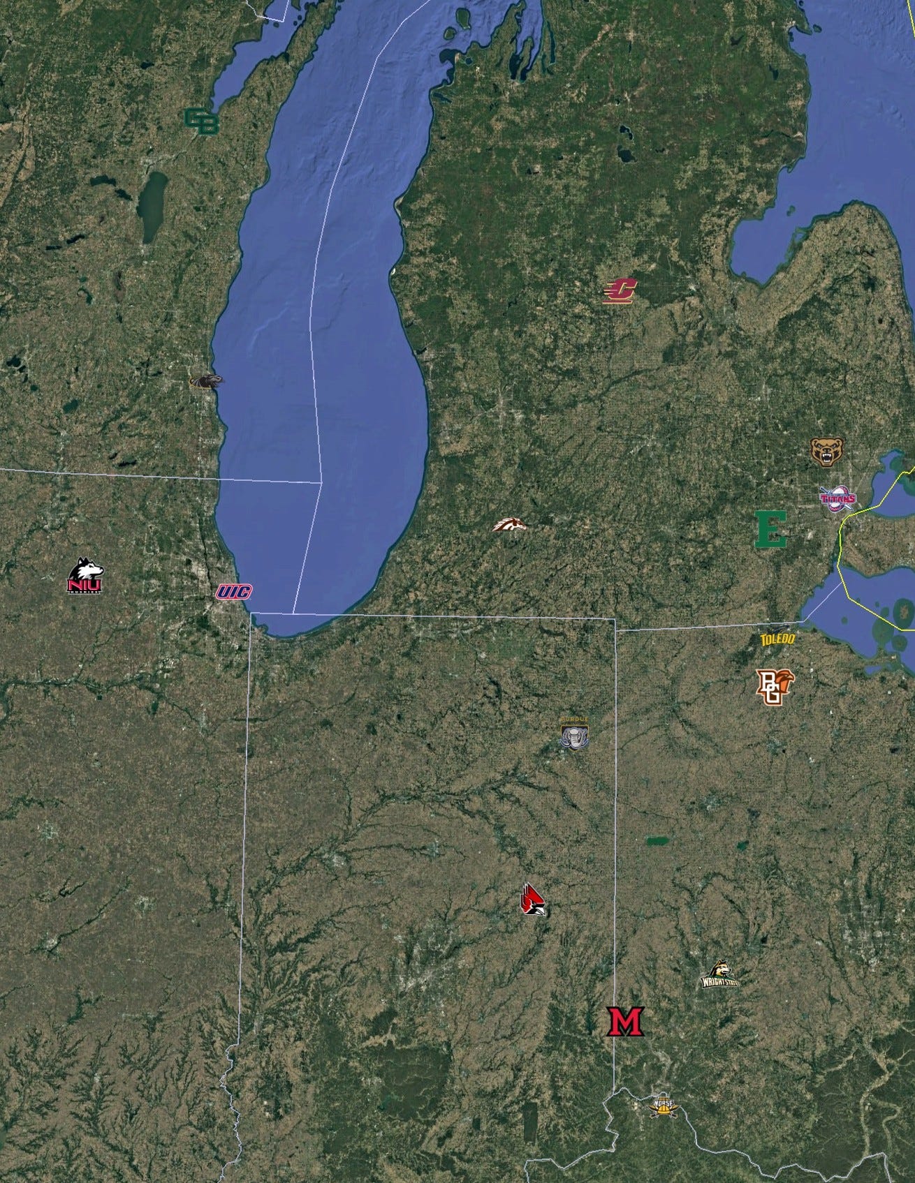 Ball State, Bowling Green, Central Michigan, Detroit Mercy, Eastern Michigan, Green Bay, Illinois Chicago, Miami (OH), Milwaukee, Northern Illinois, Northern Kentucky, Oakland, Purdue Fort Wayne, Toledo, Western Michigan, Wright State