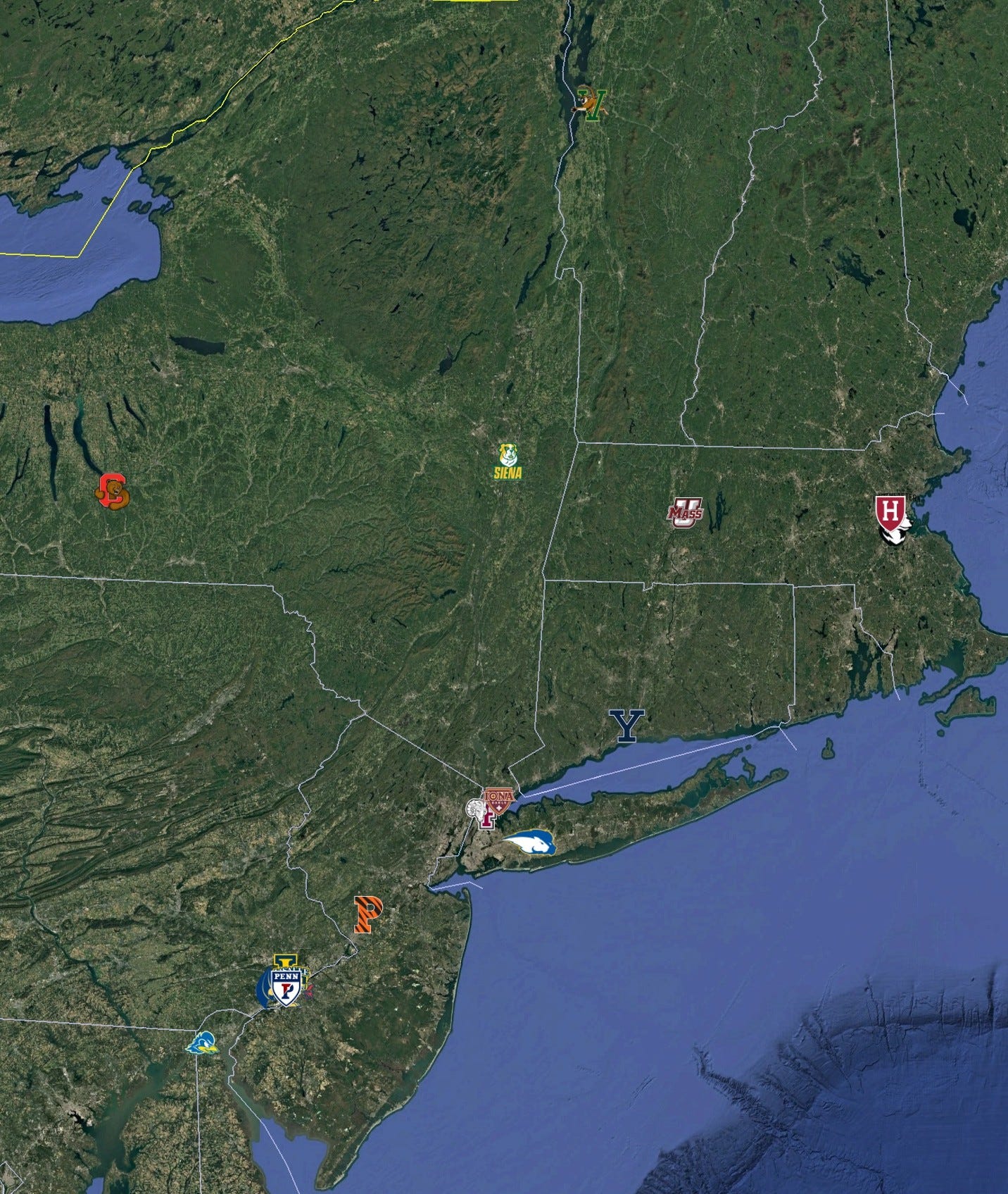 Cornell, Delaware, Drexel, Fordham, Harvard, Hofstra, Iona, LA Salle, UMass, Northeastern, Penn, Princeton, Siena, Vermont, Yale