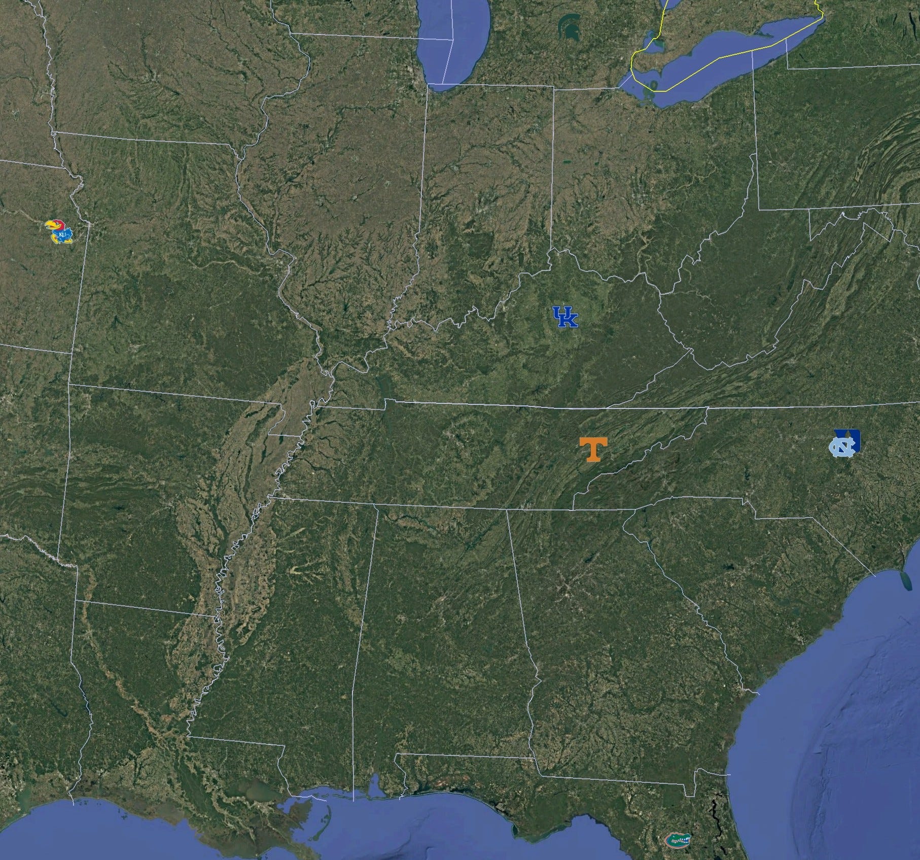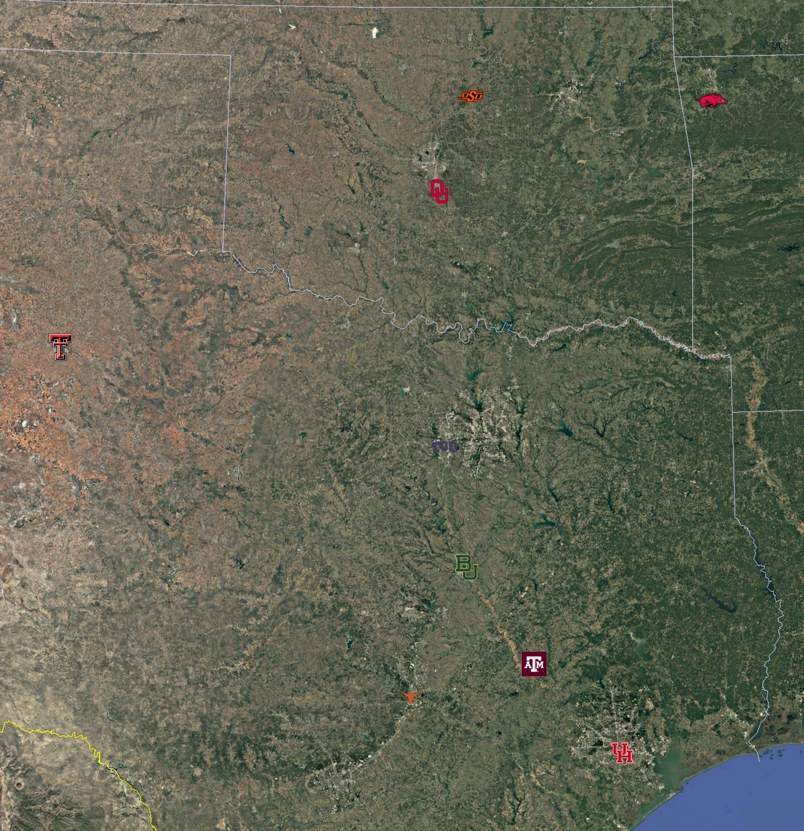 A pretty distilled core of Big 12 country, mostly consisting of current and former teams. And also Arkansas, because why not.