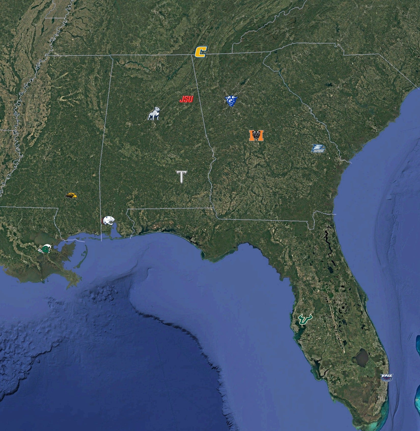 Chattanooga, Florida Atlantic, Georgia Southern, Georgia State, Jacksonville State, Mercer, Samford, South Alabama, South Florida, Southern Miss, Troy, Tulane