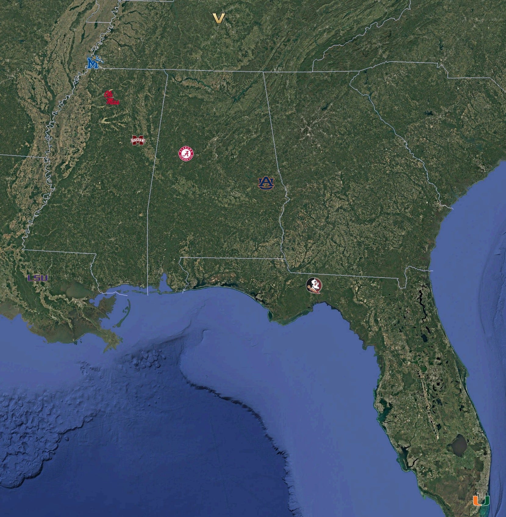 Alabama, Auburn, Florida State, LSU, Memphis, Miami (FL), Ole Miss, Mississippi State, Vanderbilt