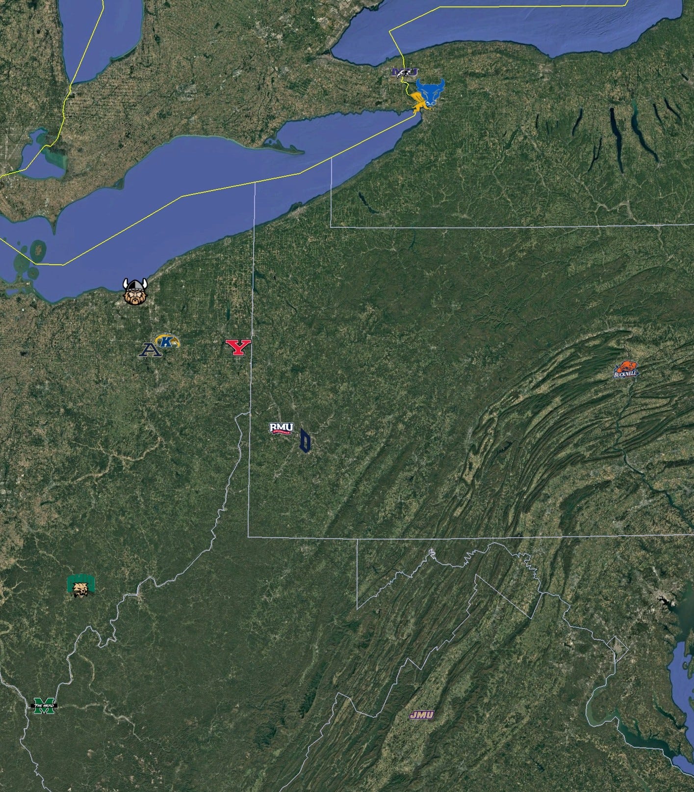 Akron, Bucknell, Buffalo, Canisius, Cleveland State, Duquesne, James Madison, Kent State, Marshall, Niagara, Ohio, Robert Morris, Youngstown State