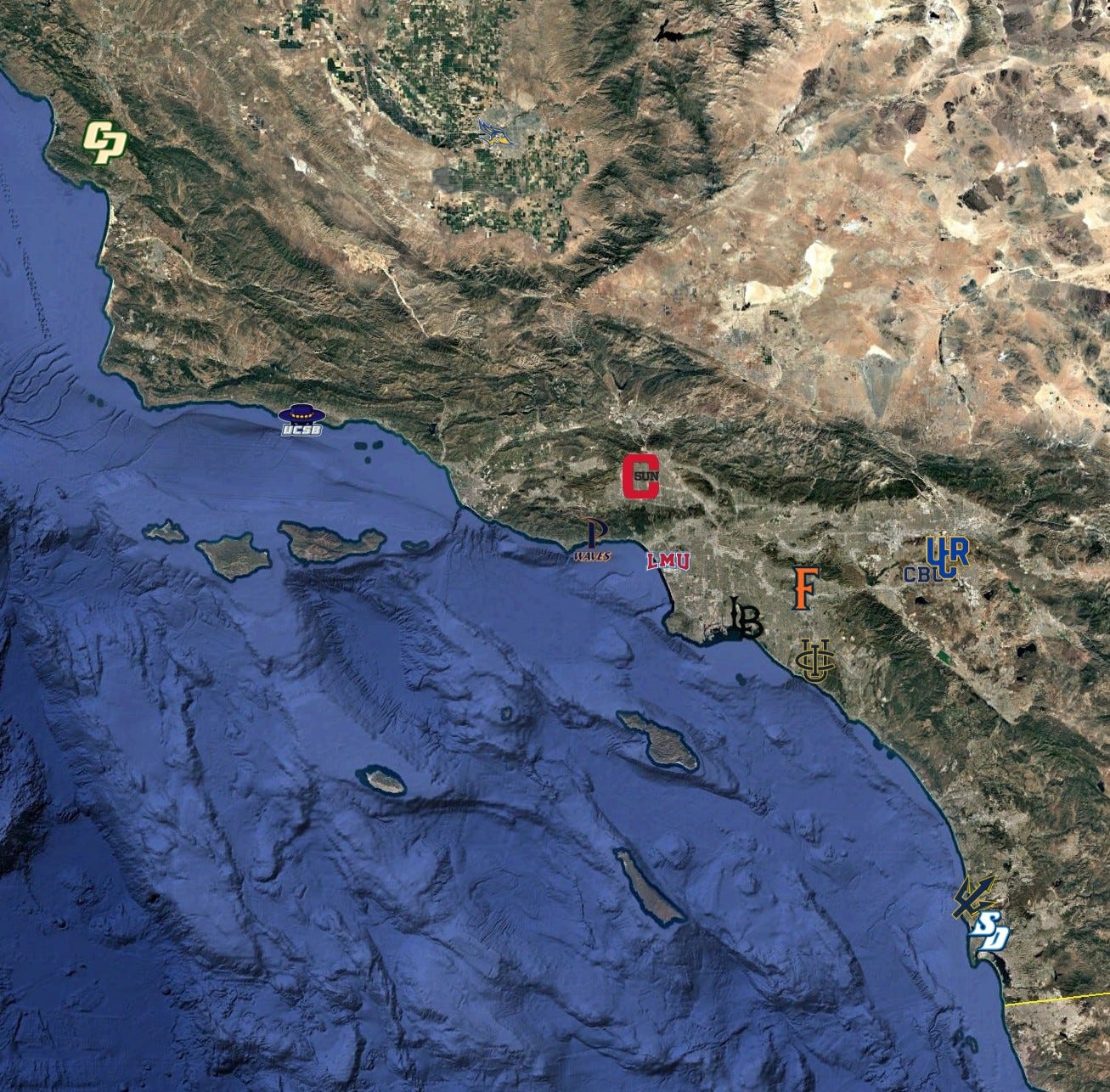 Cal Baptist, Cal Poly, Cal State Bakersfield, Cal State Fullerton, CSUN, Hawaii, Long Beach State, Loyola Marymount, Pepperdine, San Diego, UC Irvine, UC Riverside, UC San Diego, UC Santa Barbara